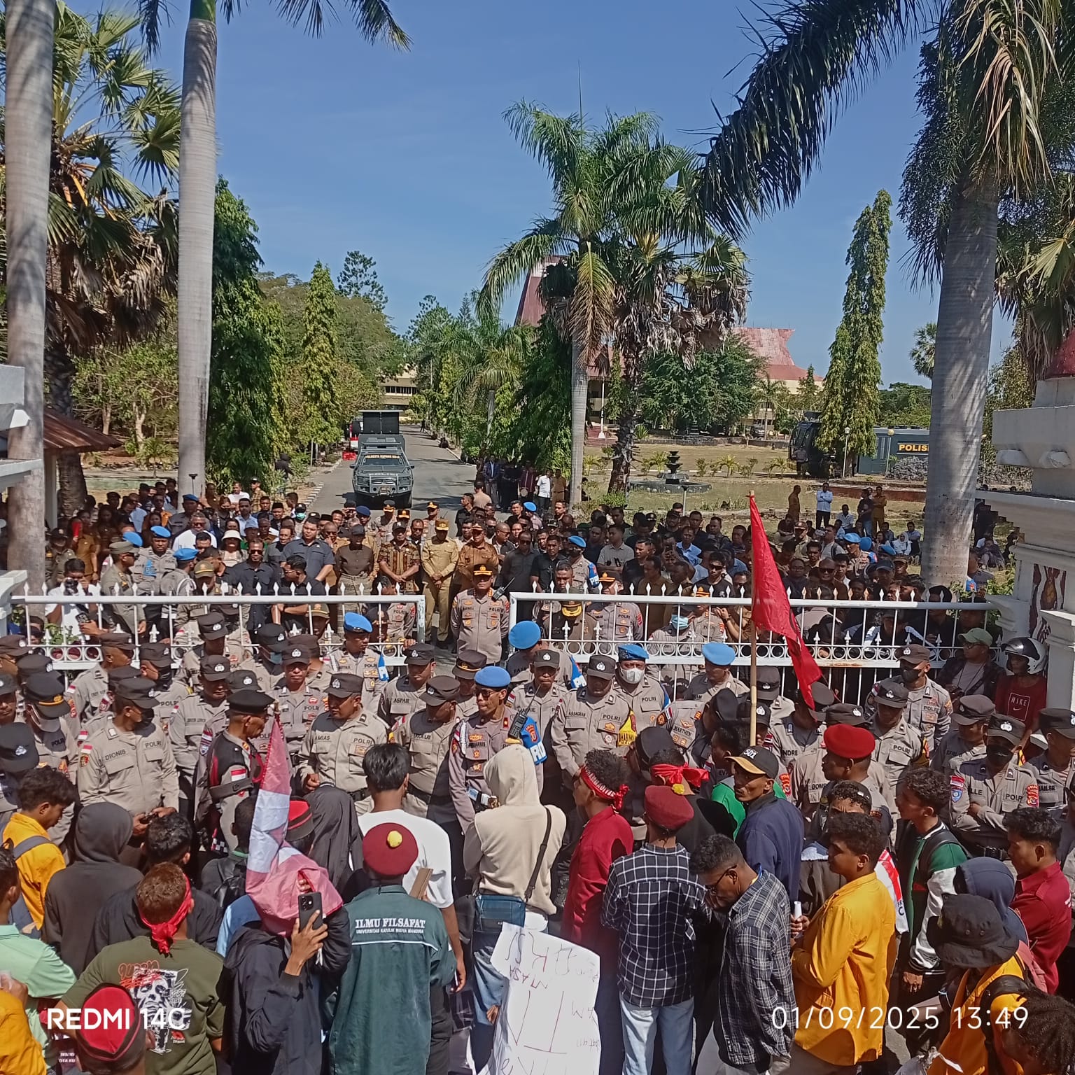 Kupang, IDEMANews_Demonstrasi mahasiswa Kupang dari berbagai kampus dan organisasi, tumpah ruah memadati halaman gedung DPRD Propinsi NTT. Sejumlah perwakilan mahasiswa dan 12 organisasi mahasaiswa secara bergantian menyampaikan orasi (Senin/1/9/2025). Demonstran ditemui langsung oleh Gubernur NTT, Bapak Emanuel Laka Lena bersama wakil gubernur, Ketua DPRD Propinsi NTT dan Kapolda NTT.