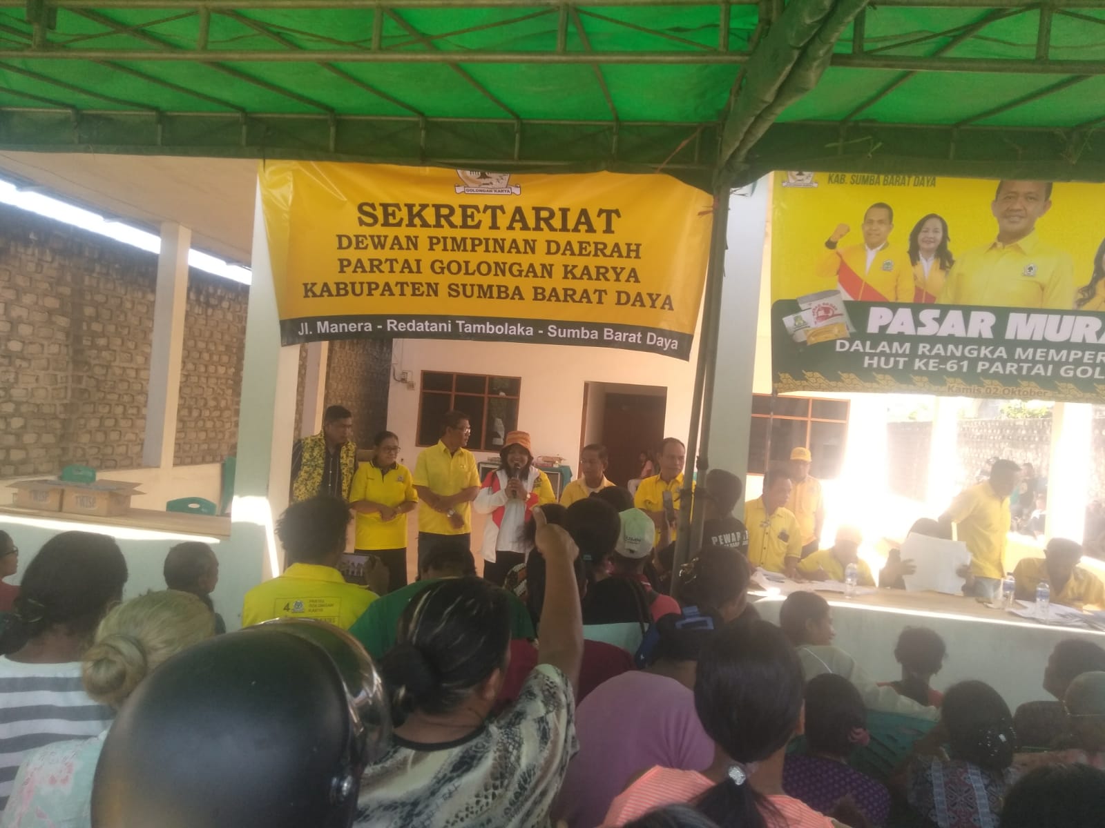 PLT Ketua DPD II Partai GOLKAR Kab. SBD menyampaikan bahwa kegiatan ini merupakan rangkaian kegiatan dan program Partai GOLKAR secara nasional dalam rangka memperingati HUT ke-61 Partai GOLKAR. “Ini salah bentuk ucapan terimakasih Partai Golkar atas kepercayaan masyarakat khusus masyarakat Kabupaten Sumba Barat Daya sehingga Golkar memperoleh 5 kursi di tingkat kabupaten, Propinsi NTT dan Pusat (RI) juga terwakili. Melalui kupon pasar murah ini kita mau berbagi, ikut meringankan keadaan masyarakat kecil. Semoga dengan bantuan ini, masyarakat bisa terbantu,” demikian PLT Ketua DPD II Partai Golkar SBD, Wilhelmintje S. Libby Sinlaeloe.
